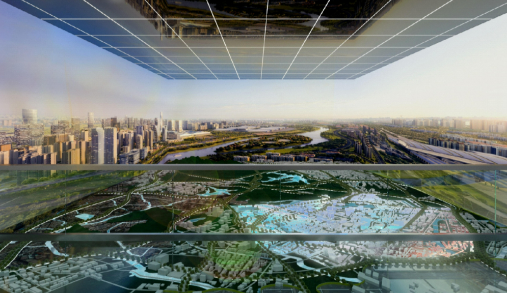 此次长沙国际会展新城规划展示厅以“未来新城”的概念贯穿全馆,总体讲述会展新城片区未来规划与发展动向,为观众展现一座宜居、宜商、宜业的永不落幕的未来之城。长沙国际会展新城片区以“中部国际会展名城、内陆对外开放高地”为整体定位,重点发展以会展和自贸产业为特色的高端现代服务业,着力打造会议会展经济崛起展示区、自由贸易深度合作先行区、国际交往文化创意示范区。展厅部分效果图