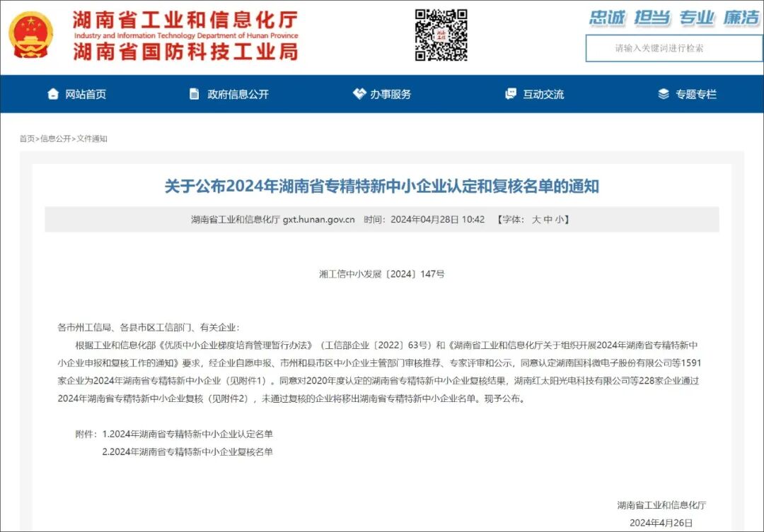 湖南省工业和信息化厅公布专精特新中小企业认定和复核名单