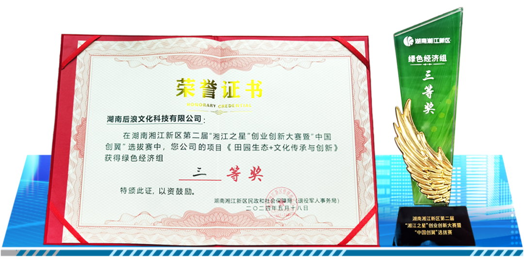 5月18日,以“创响新时代 共圆中国梦”为主题的湖南湘江新区第二届“湘江之星”创业创新大赛暨“中国创翼”选拔赛决赛在岳麓科创港举行。经过激烈角逐,湖南后浪文化科技有限公司以“田园生态+文化传承与创新”项目获得三等奖。