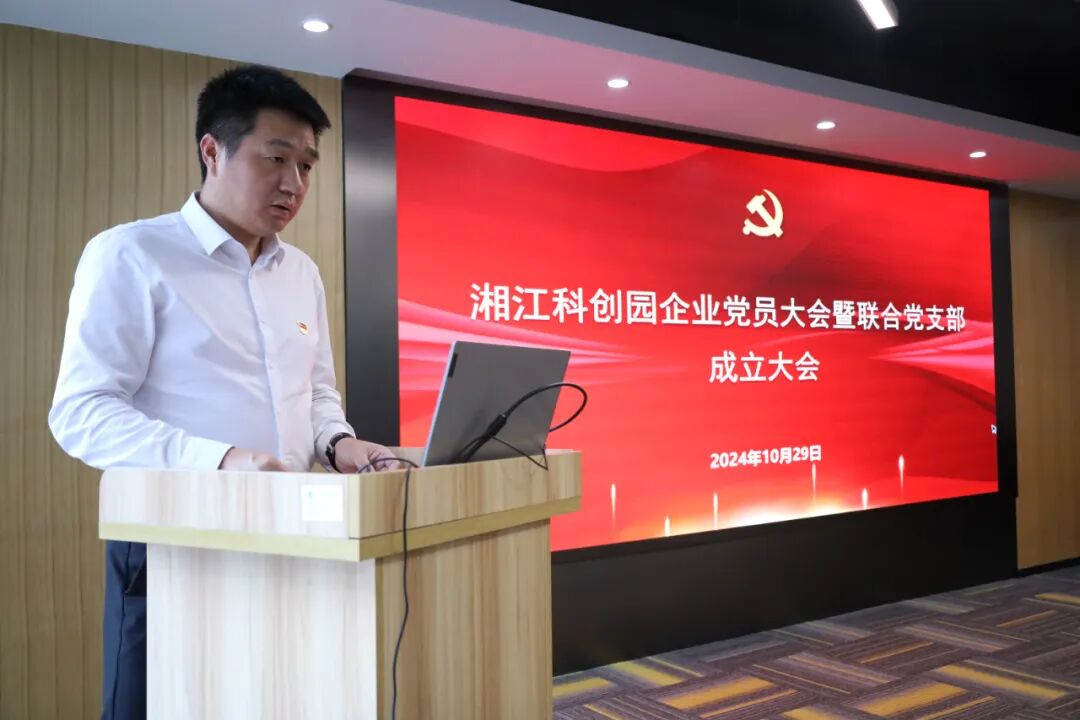 党建领航新征程,金秋收获正当时。10月29日下午,湘江科创基地举行了“湘江科创园企业党员大会暨联合党支部成立大会”,湘江科创园首个联合党支部正式成立。湖南湘江新区两新党委专职副书记、组织工作部两新工委办公室主任杨峥嵘,湘江集团人力资源中心(党委组织部)总经理高美梁,以及岳麓街道、枇杷塘社区有关领导应邀莅临成立大会并为联合党支部揭牌,大科城公司党支部书记、执行董事、法定代表人夏伟辉等出席会议。园区相关企业党员参加会议。
